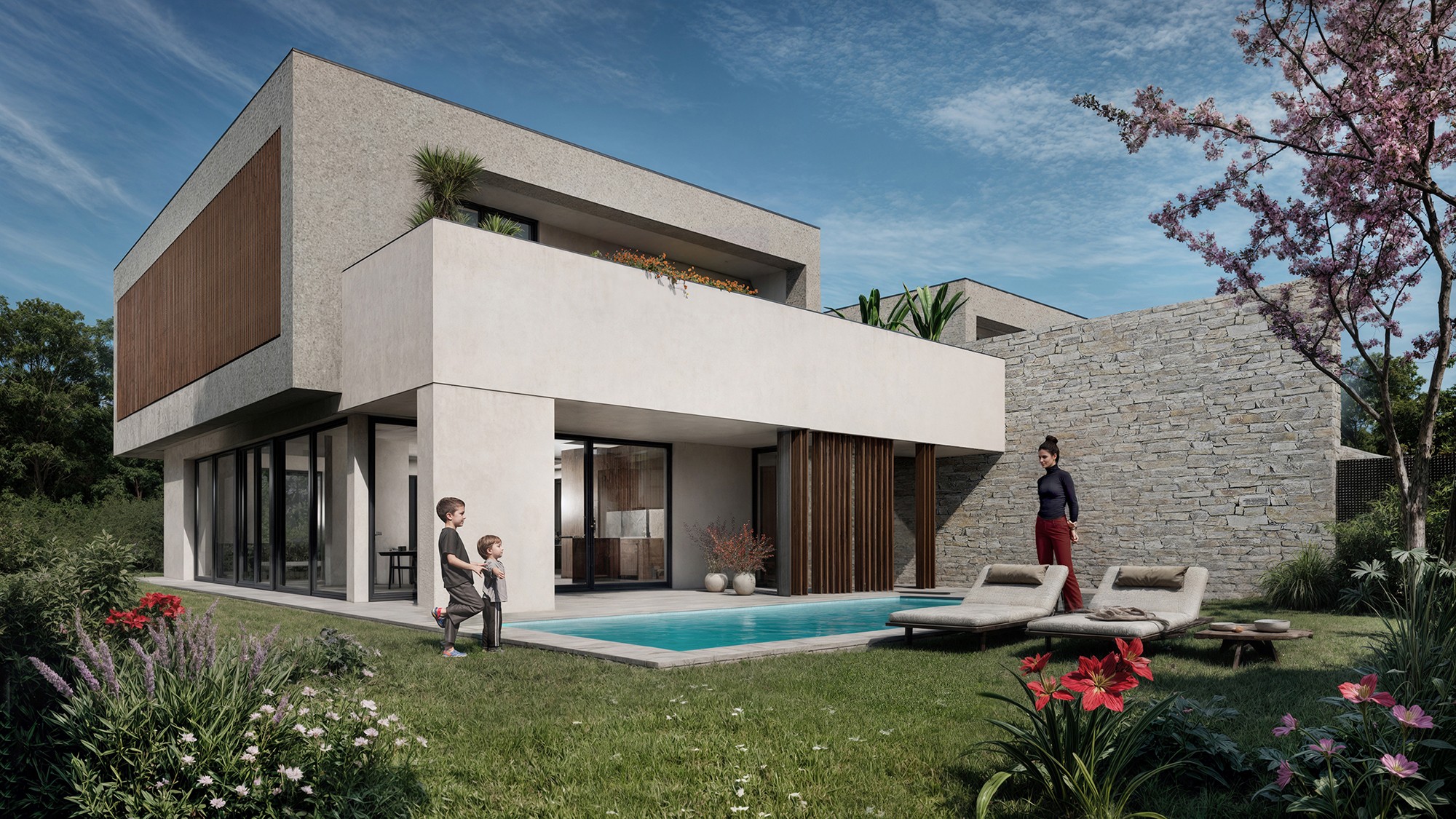 Linee pulite e moderne che disegnano una raffinata solidità. Giochi di luce che dipingono emozioni autentiche tra legno, pietre, foglie e fiori. Dettagli di pregio e materiali naturali che rendono ogni villa unica e preziosa.